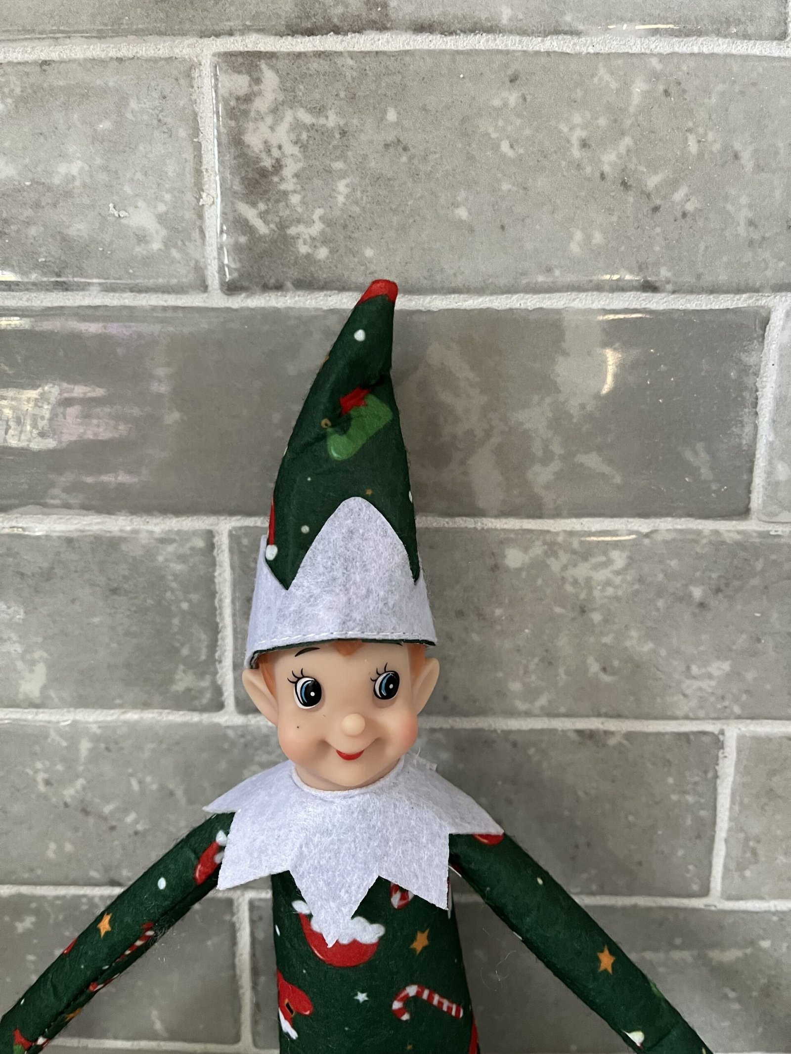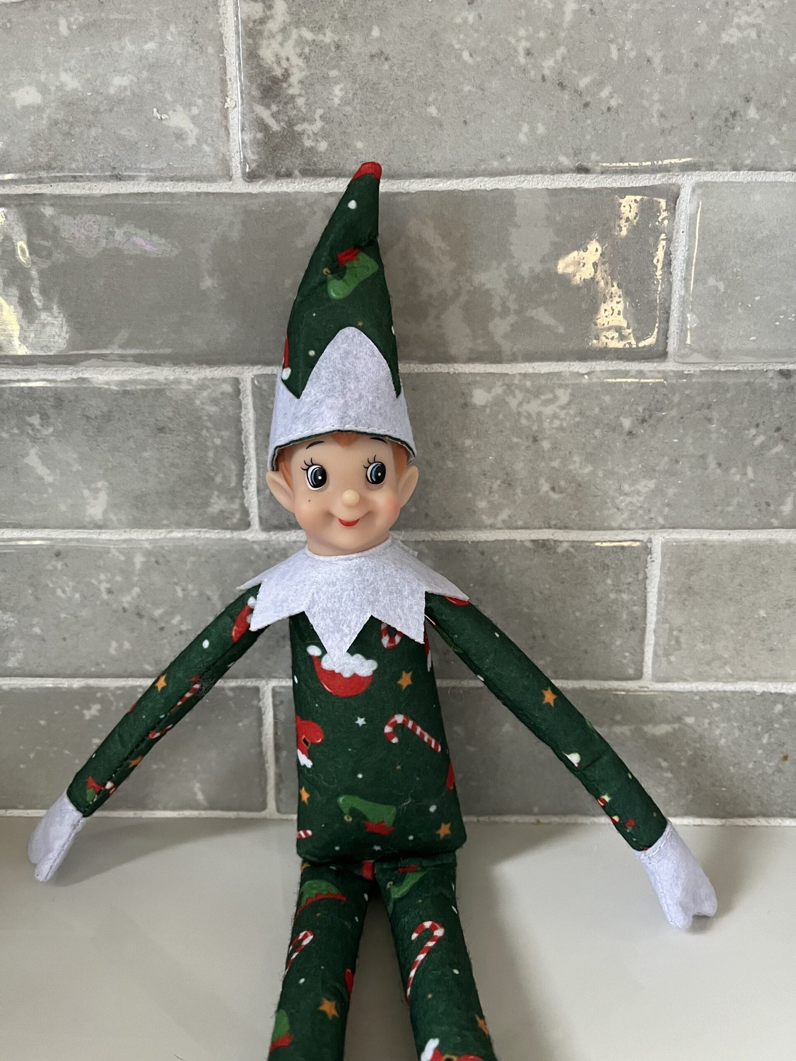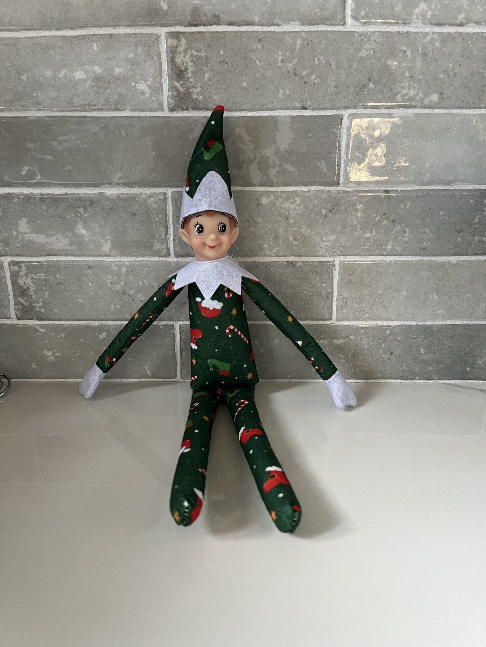 Introducing The Christmas Cadets. The newest elf doll around. Elf measures approximately 13 inches tall and contains wire for easy posing. This elf is dressed in green with a Christmas print scattered all over.